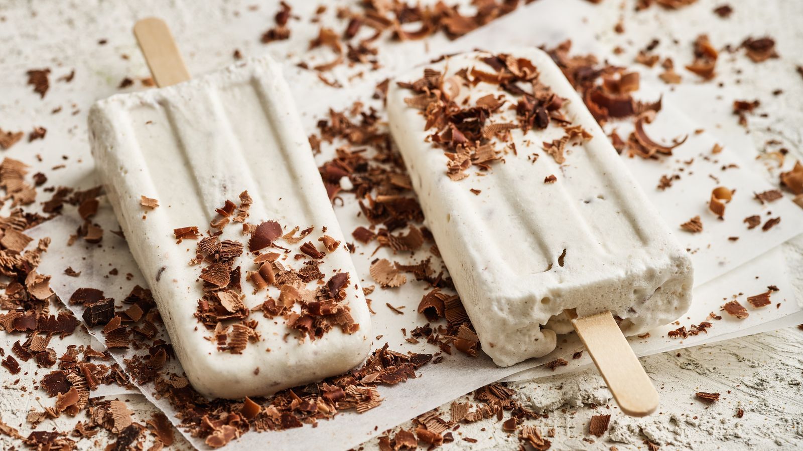 Die Masse in die Eis-Form füllen, die Holzstiele hineinstecken und ca. 4 Std. in den Tiefkühler stellen. Anschliessend die Eis-Form kurz unter heisses Wasser halten, das Stracciatella-Eis aus der Form lösen, mit 10 g Schokolade bestreuen und sofort geniessen.